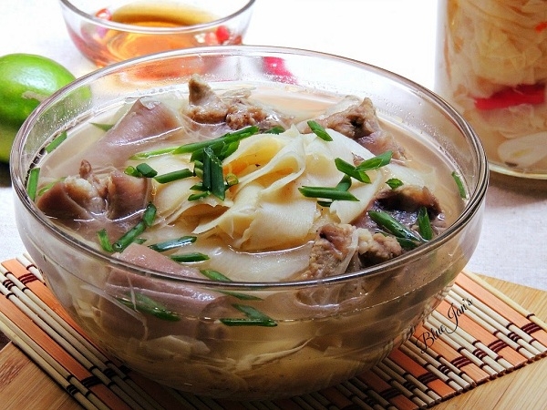 Với món ăn từ miền núi thì thịt lợn và măng tươi là không thể thiếu. Măng tươi bạn đem bóc vỏ, thái miếng vừa ăn, rửa sạch rồi luộc qua nước sôi rồi rửa nhiều lần để hết vị đắng. Sườn chặt vừa ăn, chần qua nước sôi, rửa cho sạch. Cho ít dầu ăn vào nôi rồi xào sơ qua với sườn lợn, măng, nêm 2 thìa bột nêm, đảo đều cho thấm gia vị. Tiếp đến cho nước vào vừa đủ. Nếu muốn ngon hơn bạn cũng có thể cho một ít thịt nạc vào. Đun sôi khoảng 30 phút đến khi thịt và sườn mềm là dùng được. Nêm nếm lại cho vừa khẩu vị. Món ăn này có vị ngọt tự nhiên của sườn, nước dùng đậm đà gia vị cùng vị giòn ngọt của măng tươi chứa nhiều chất xơ sẽ giúp bạn dễ tiêu hóa và bổ dưỡng.
