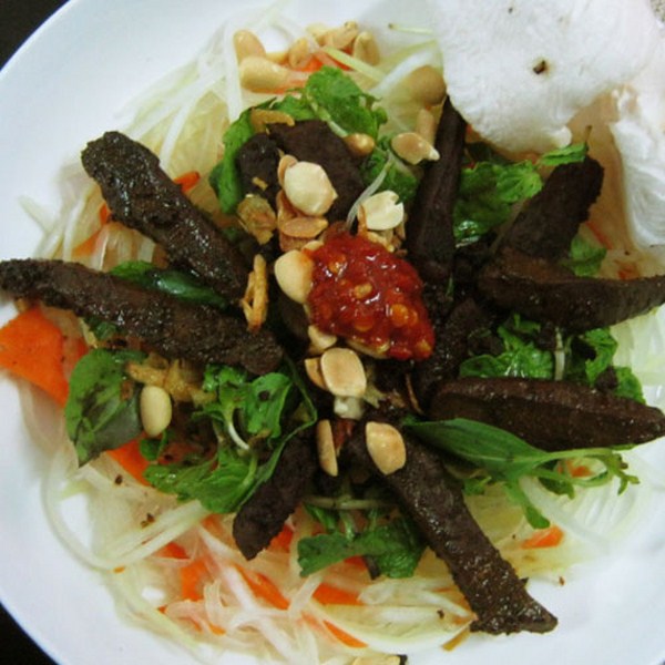- Gan thái miếng mỏng với xì dầu, ít sa tế, ít giấm và dầu mè với đậu phộng giã dập cùng dưa chuột và hành cắt sợi trộn đều trong 10 phút tạo nên món gan trộn cực kỳ hấp dẫn