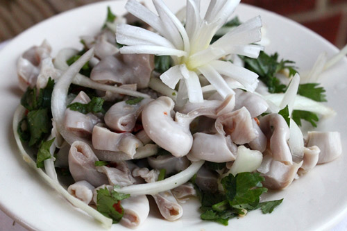 - Sau khi lòng chín, vớt lòng ra thả ngay vào bát nước đá có vắt chanh (một số người pha phèn chua hoặc dấm gạo cũng được). Nhớ là nước phải ngập lòng. Việc làm lạnh đột ngột cùng với vị chua sẽ giúp lòng trở nên trắng giòn. Ngâm cho lòng nguội rồi vớt ra thái ăn. Nhiều người để an tâm hơn, sau khâu ngâm nước đá có thể nhúng lại vào bát nước đun sôi để nguội, tuốt bỏ các dịch vẫn còn bên trong. Ăn kèm rau húng, chấm nước mắm cốt pha gừng, ớt, chanh. Miếng lòng trắng, giòn rụm, thơm ngon.