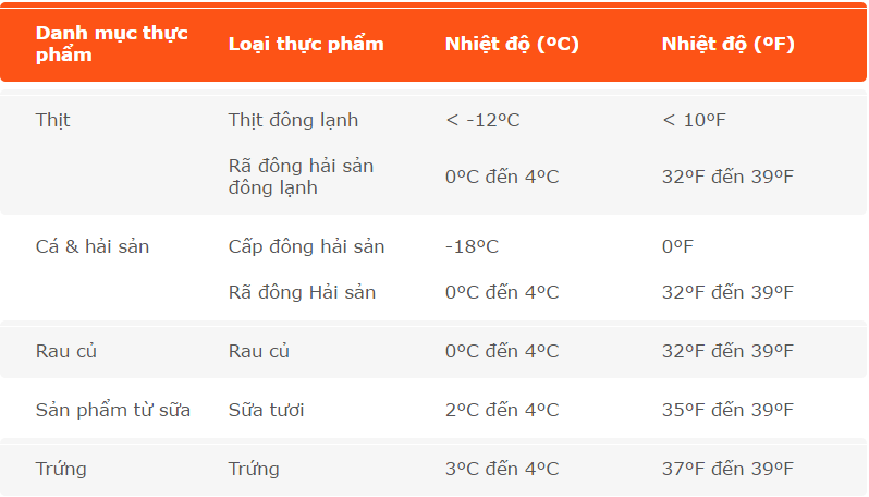 Các loại thực phẩm khác nhau yêu cầu nhiệt độ lưu trữ tối ưu khác nhau. Bảng biểu sau đây sẽ đưa ra nhiệt độ cần thiết trong việc lưu trữ các loại sản phẩm thực phẩm khác nhau:
